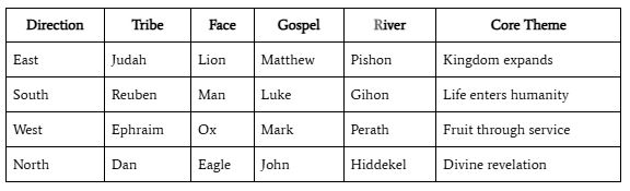 From this very place, we have four rivers that are God’s life flowing to the whole earth. Through the tribes, life flows. Similarly, the four Gospels are God’s full testimony of the Messiah to the whole world. What began in Eden as one river flowing into four directions becomes in Yeshua one truth in four witnesses.